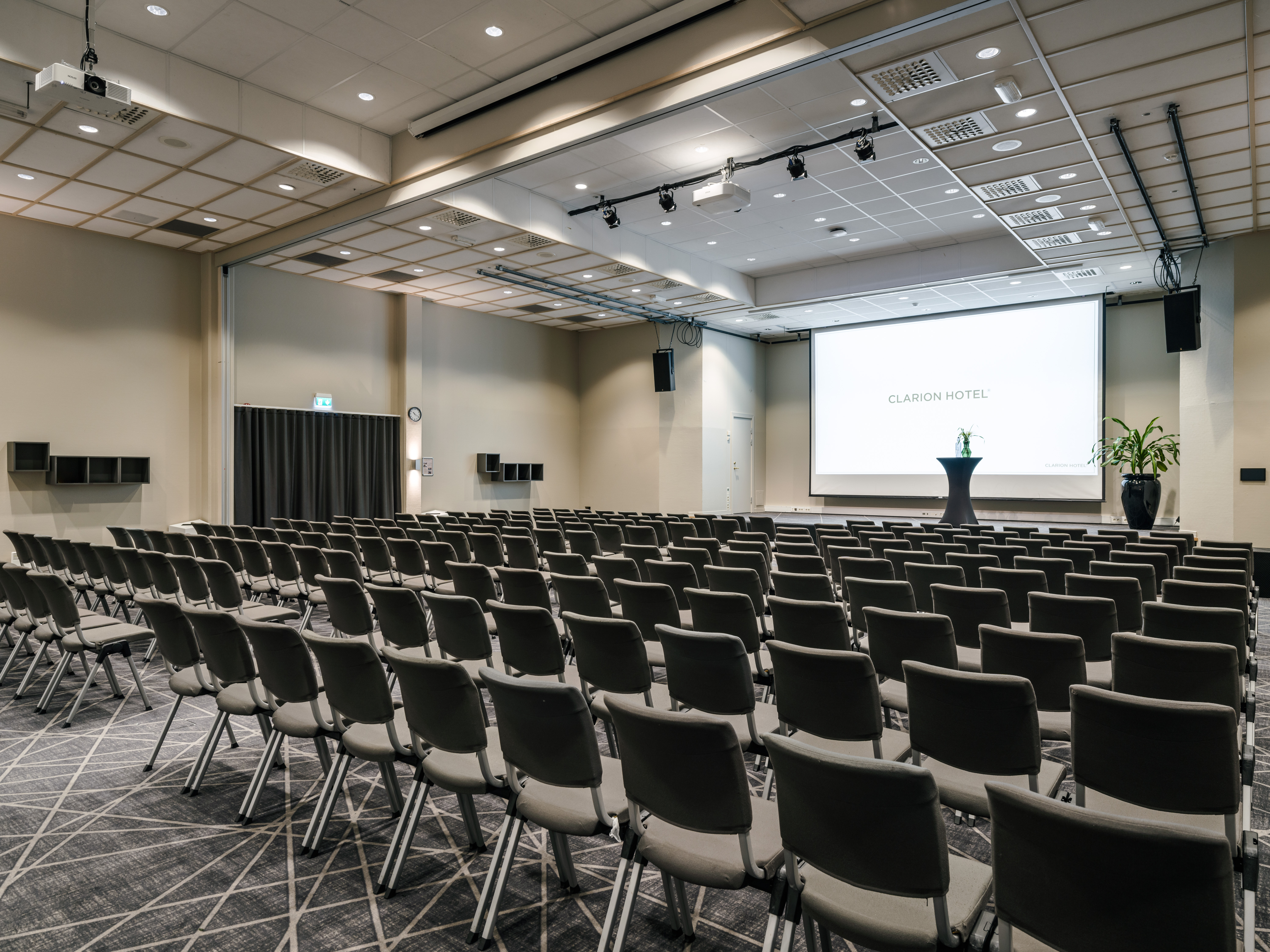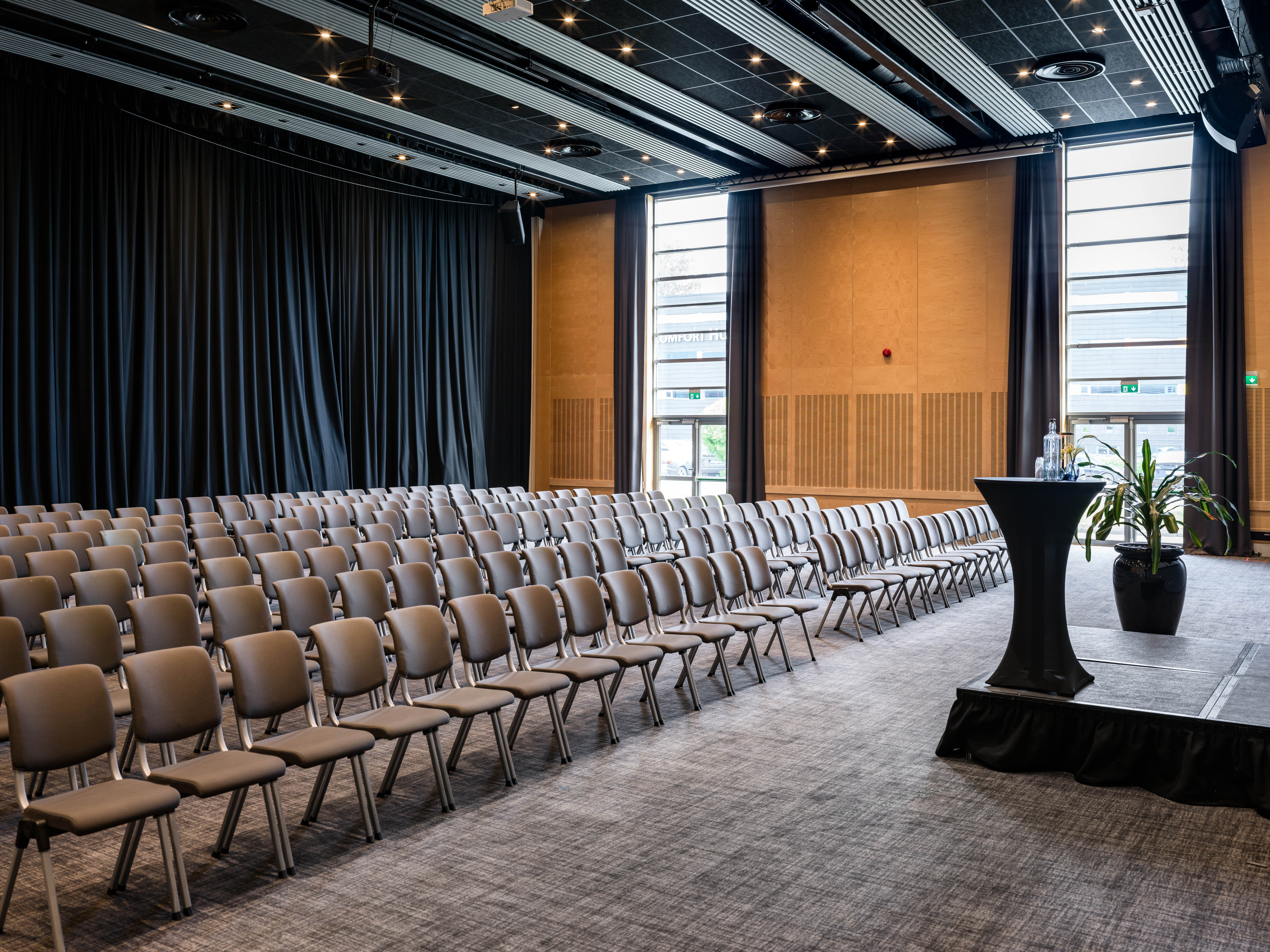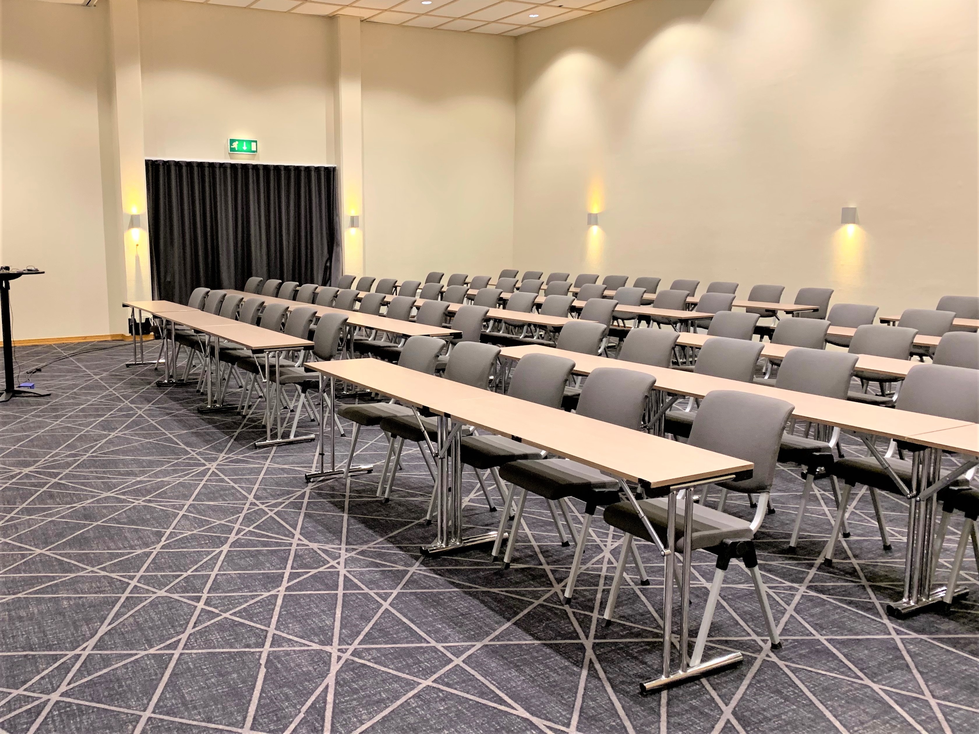 Skoleoppsett: 208 Bankett: 162 Kino: 300 Dagslys: Ja